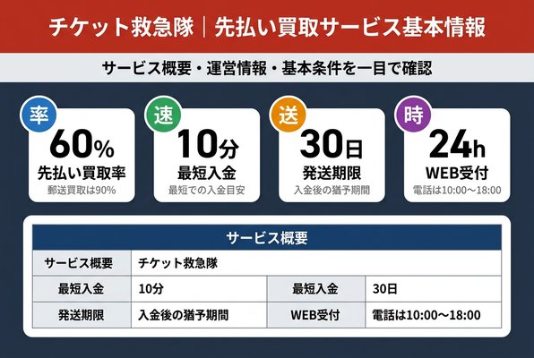 まずは、チケット救急隊の先払い買取サービスの概要を「サービス内容」と「運営会社情報」に分けて整理します。