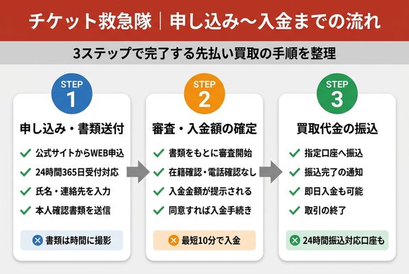 実際にチケット救急隊で先払い買取を利用する際の流れを3ステップで整理します。